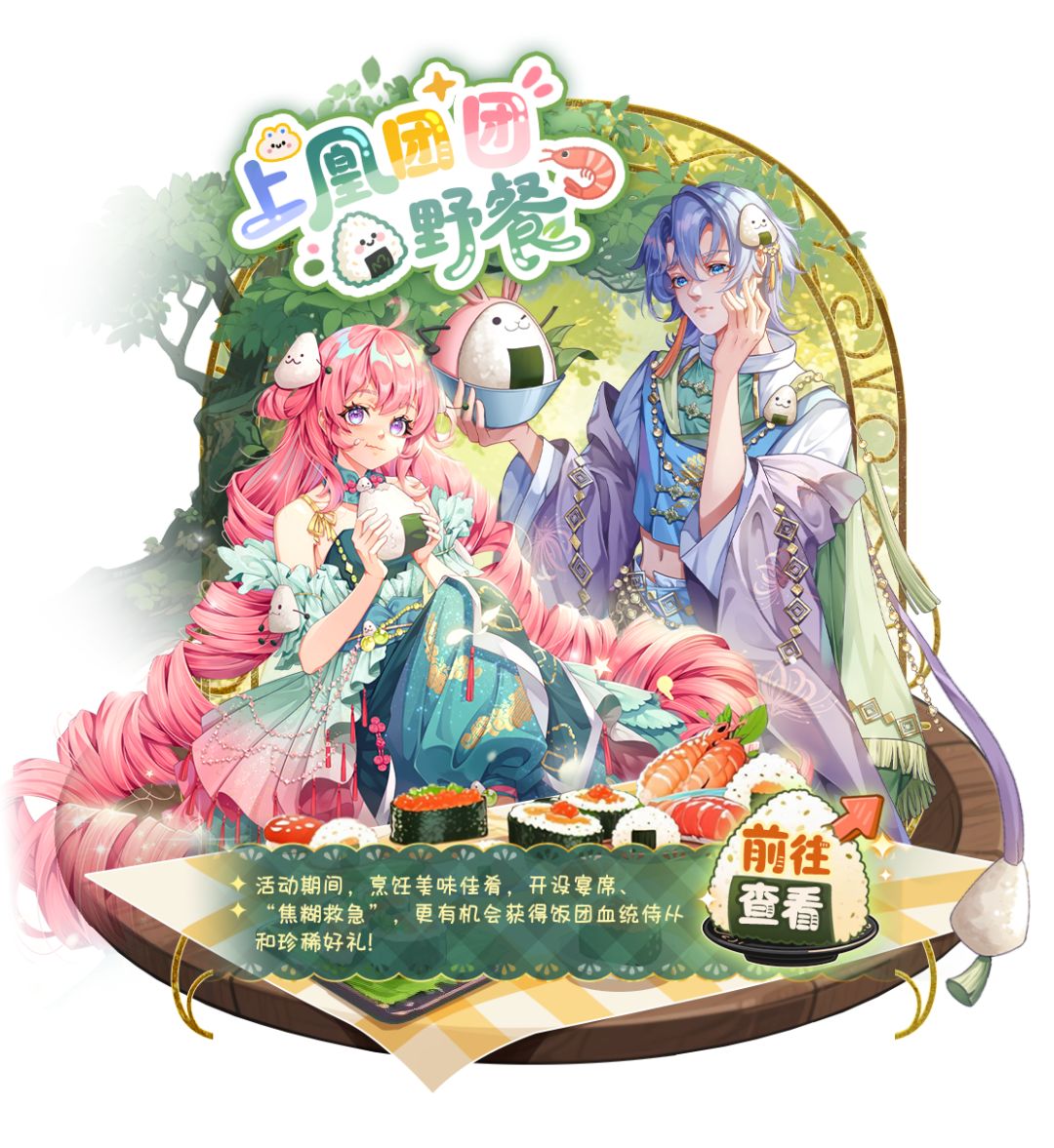 1、8月1日00:00至8月7日23:59期间,上凰团团野餐活动限时开启;活动期间,收集食材烹饪菜肴,集齐菜肴开设宴席,亲朋好友可参与宴席哦,参与活动排行、完成活跃任务、达成活动成就,还可获得限时称号与稀有活动奖励,更有机会获得饭团血统国士侍从“谢珺菡”及其信物“角团履”、饭团血统天命侍从“石锦初”及其信物“嬉兔团”