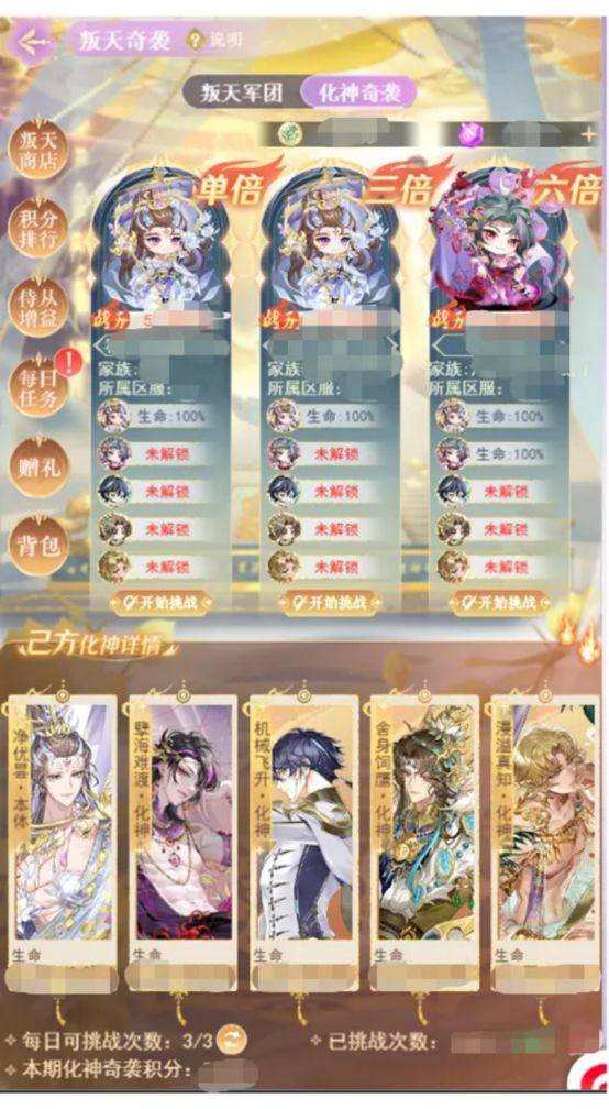 6、叛天奇袭最终将根据个人累计的本期积分总数、家族累计的本期积分总数、化神奇袭中的活动积分分别进行排名,名次越靠前获得的奖励越好;个人排行有机会获得奖励神御·紫炁极、神御·亿姹时、神御·嫣之语、神御·绶金垂,排名第一还可获得限时称号“叛天梦魇”,排行第二至第五将获得限时称号“不败王者”;家族排行有机会获得活动兑换卡、灵犀、天命解封石礼包、幻翼精魄、银币,排名第一还可获得限时族徽“平叛光印”,排名第二至第五将获得限时族徽“骁勇圣刻”;【化神奇袭】排行榜中有机会获得帝释天闪卡礼盒、神御·紫炁极、神御·亿姹时、神御·嫣之语等奖励
