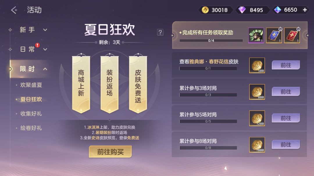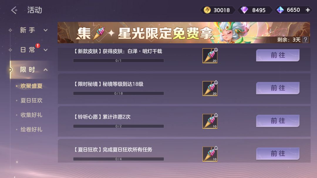 集冰淇淋,星光皮肤免费拿。参与限时秘境、铃听心愿、夏日狂欢活动,最高可获得冰淇凌*60。