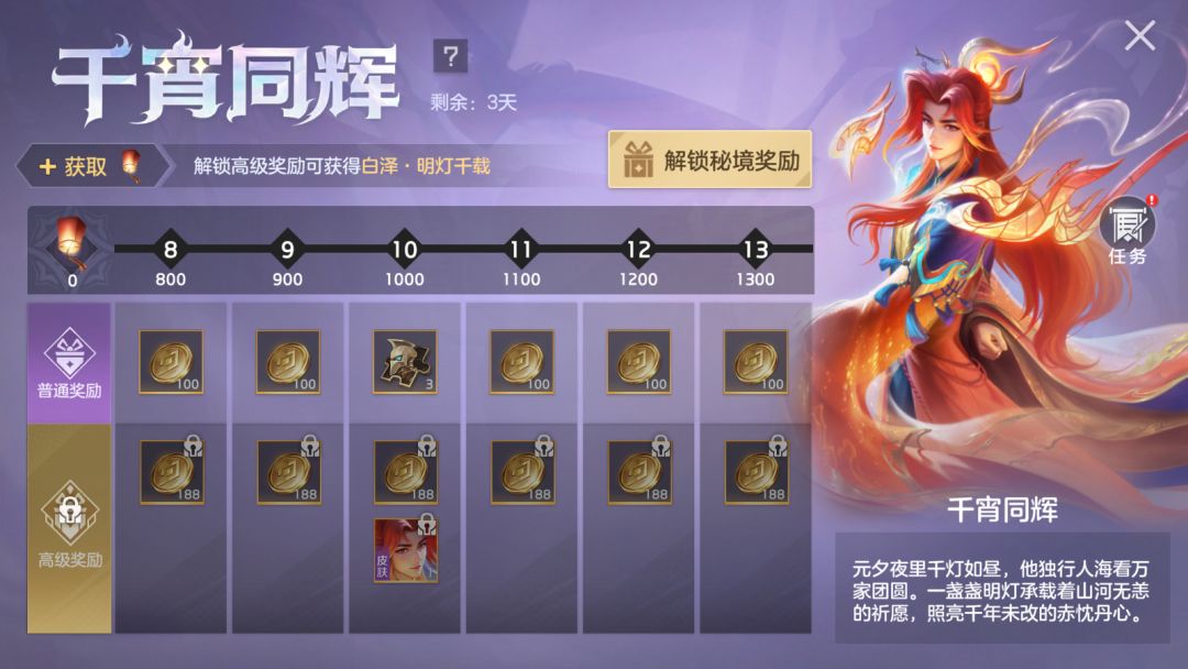 完成任务提升等级免费获取3天满级星盘特权卡、英雄碎片等奖励;付费30元可得新款史诗皮肤白泽·明灯千载、可爱滴捏表情;付费128元可额外获得传说限定皮肤王昭君·一念山海、王昭君好感度礼包。