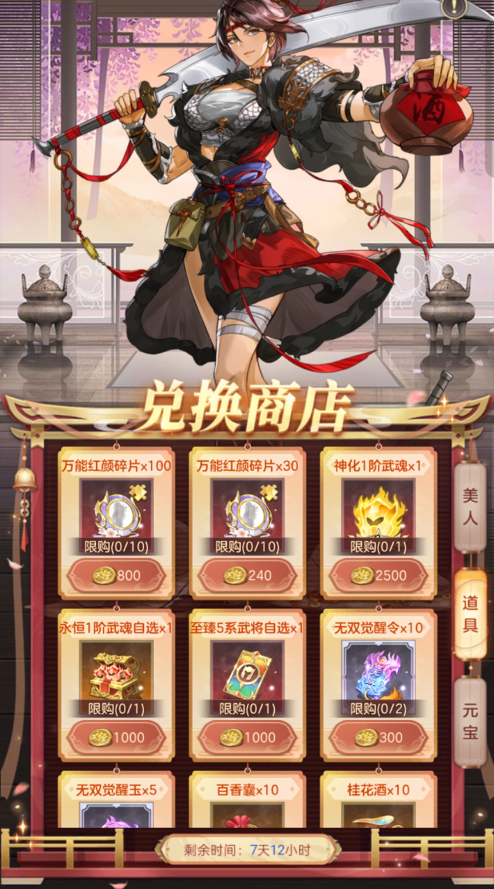 兑换商店分为美人商店和道具商店可以兑换各种美人和道具哦!