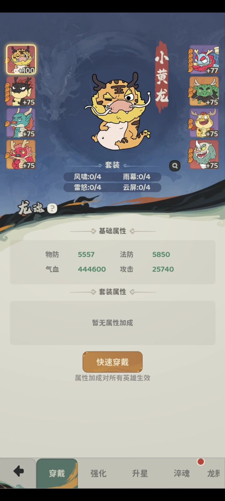 共八种龙,每种龙穿戴最高品质就行,基础属性会高挺多,品质分绿,蓝,紫,橙,红,金,洪荒龙魂(?)