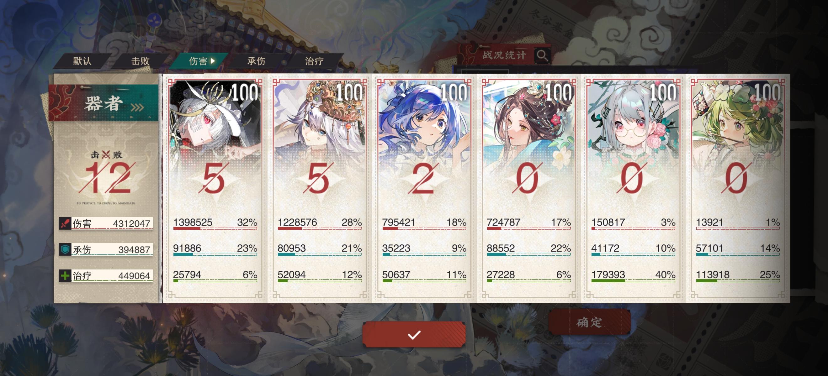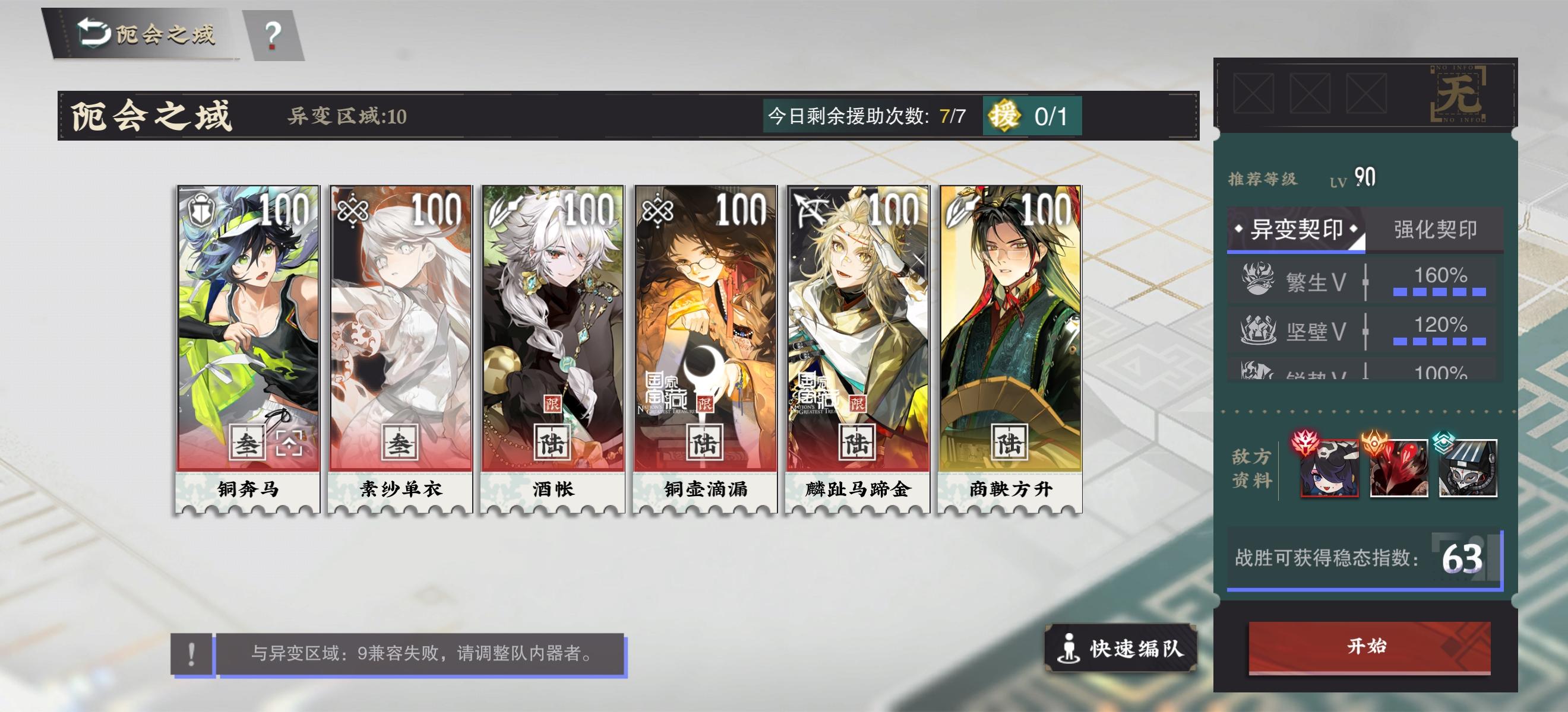 组队上基本不变,1、3、5关都是滴漏(保人、续能量)+酒帐(主C)+马蹄金(放麟趾金吸引火力、奶人、给盾)+洛神(保人、奶人)+商鞅(抗伤、吸引火力)+焕彰高速小马/铜坐龙(吸引火力);2、4、6关是以银雀山真珠为核心的战略队,素纱保人,百花奶人加buff,鸟音加防加buff加弹药奶人,海水江崖炉副C、上buff