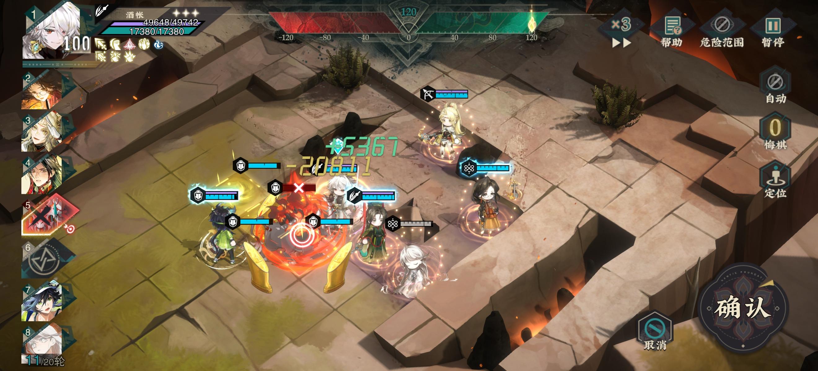 第11关有点子恶心人了,用的6931带队过,先吐槽一下,之前没见过那个轻锐猫开大,没想到这玩意儿开大直接扫全场,这**是轻锐还是构术😅,建议酒帐开局就冲到上面去,头两个回合把那两只轻锐猫解决掉,滴漏带流云点储能放酒帐后行动(词条不重要),第一回合给酒帐打过的猫A一下,再给酒帐上职业技,然后去上面把远击弄晕(所以滴漏起码要三致知),马蹄金开职业把麟趾金射到另一只猫旁边然后找个角落猫着,第二回合滴漏给自己上buff,要赌远击打滴漏别打其他人,酒帐解决两只猫,第三回合酒帐要解决掉远击,剩下的就很好办了(主包重开好几把,凹到悔棋全用完了,才做到无阵亡通过(是的,主包也是很菜很菜的![[表情_捂脸哭]](https://img.tapimg.com/market/images/83aa452eea88b5c64df710bca367b7e9.png)