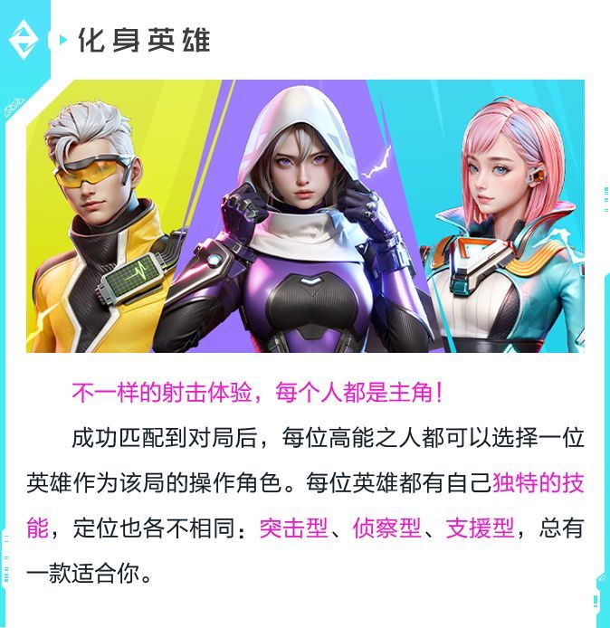 天赋各异的超级战士们组成3人或4人小队,相互配合,在不断缩小的信号安全区中击败其他的小队,成为最后的胜利者。