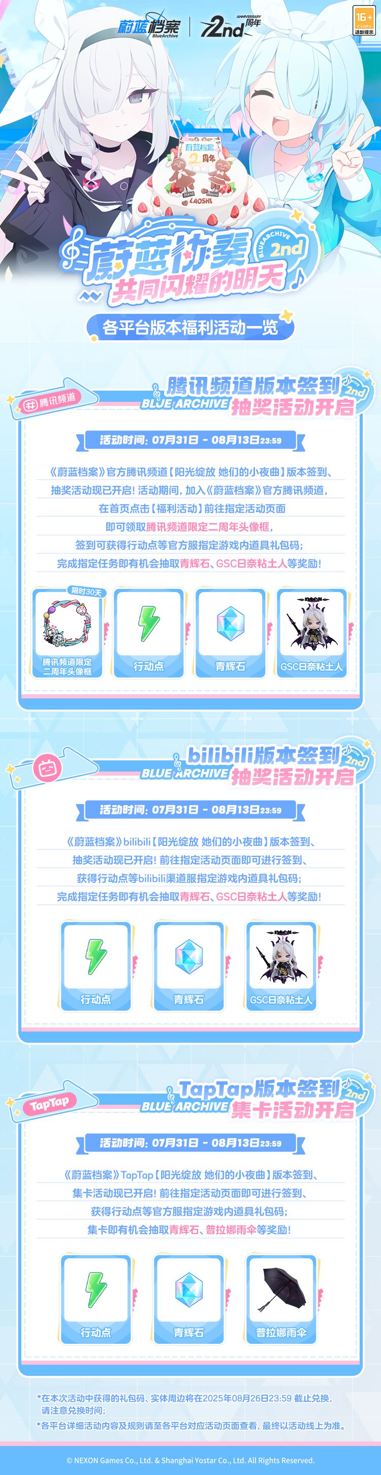 《蔚蓝档案》二周年【阳光绽放 她们的小夜曲】版本福利活动一览