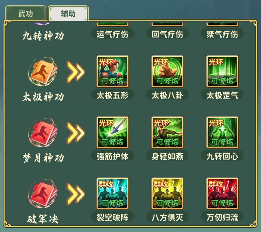 团队输出多偏脆皮,就主要携带加防御的buff,如:太极八卦、太极罡气、身轻如燕。
