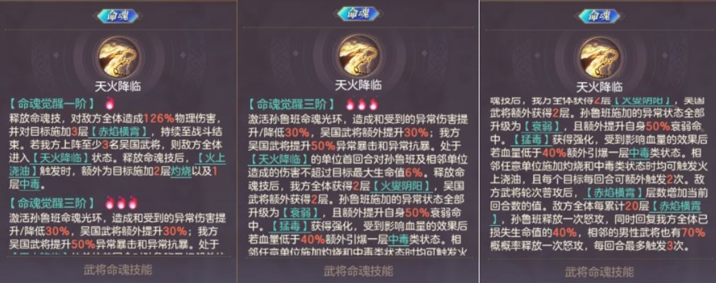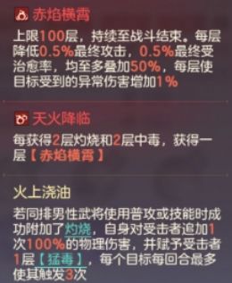 1、联动火毒,吴国卡额外加成:基于传统大虎的火毒联动进一步加强,增加了根据火毒层数加挂的核心debuff,赤焰横霄。光环类核心效果对吴国有额外加成,进不了女队,吴国火烧及火毒专属。