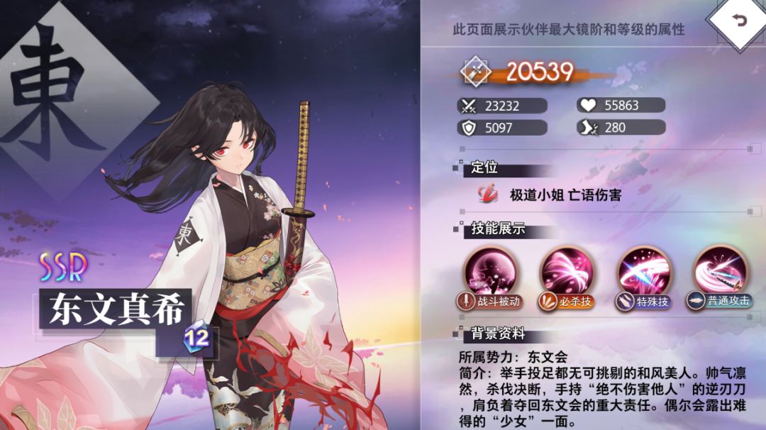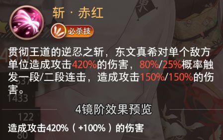 贯彻王道的逆忍之斩,东文真希对单个敌方单位造成攻击420%的伤害,80%/25%概率触发一段/二段连击,造成攻击150%/150%的伤害。
