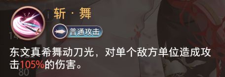 东文真希舞动刀光,对单个敌方单位造成攻击105%的伤害。