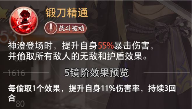 神澄登场时,提升自身55%暴击伤害,并偷取所有敌人的无敌和护盾效果。