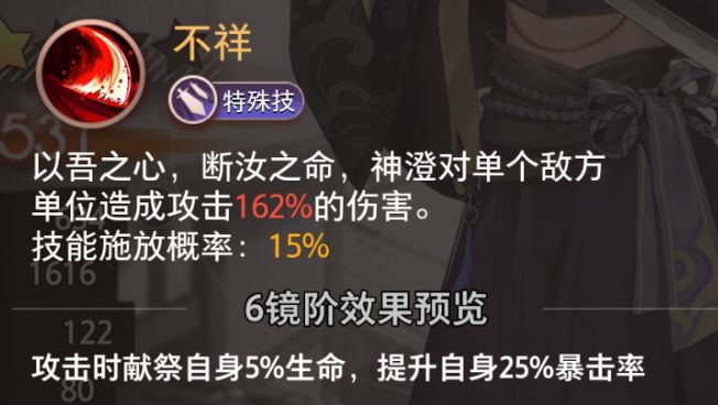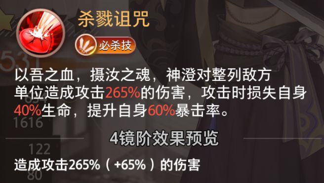 以吾之血,摄汝之魂,神澄对整列敌方单位造成攻击265%的伤害,攻击时损失自身40%生命,提升自身60%暴击率。