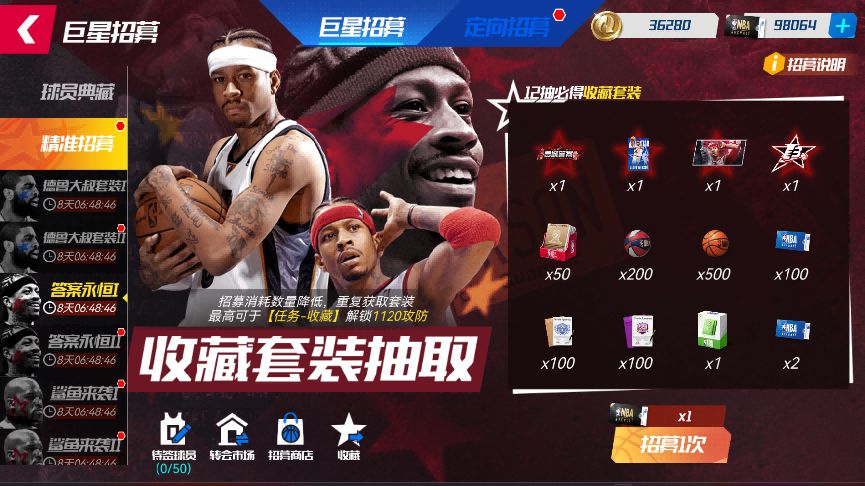 活动期间,可使用【精准招募函】在【精准招募-费城答案套装卡池I】、【精准招募-费城答案套装卡池II】池中,抽取全明星艾弗森外显套装!
