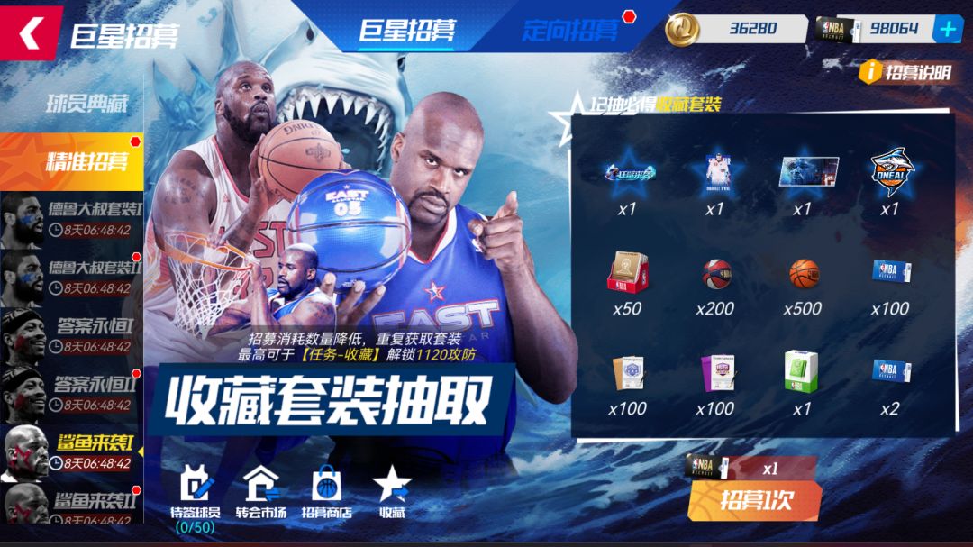 活动期间,可使用【精准招募函】在【精准招募-鲨鱼来袭套装卡池I】、【精准招募-鲨鱼来袭套装卡池II】池中,抽取全明星奥尼尔外显套装!