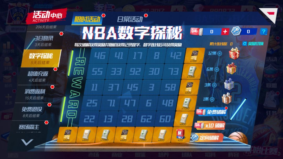 数字密码的背后,藏着怎样的NBA故事和资源宝藏?一起来破解数字,解开谜底,获取宝藏吧!进入活动时,可选择“海报”、“球迷资金”、“城市版球衣/助威棒”等所需的奖励类型哦~