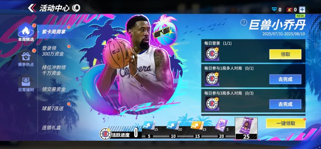 相比较S2,我们降低了获取紫卡球星的难度,活跃进度调整为25即可获得紫卡球星,同时增加了紫卡周周拿活动的开放时间,兄弟们在活动期间只需要稍微活跃一下完成任务,即可快速获得紫卡球星。