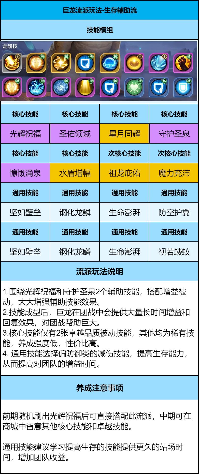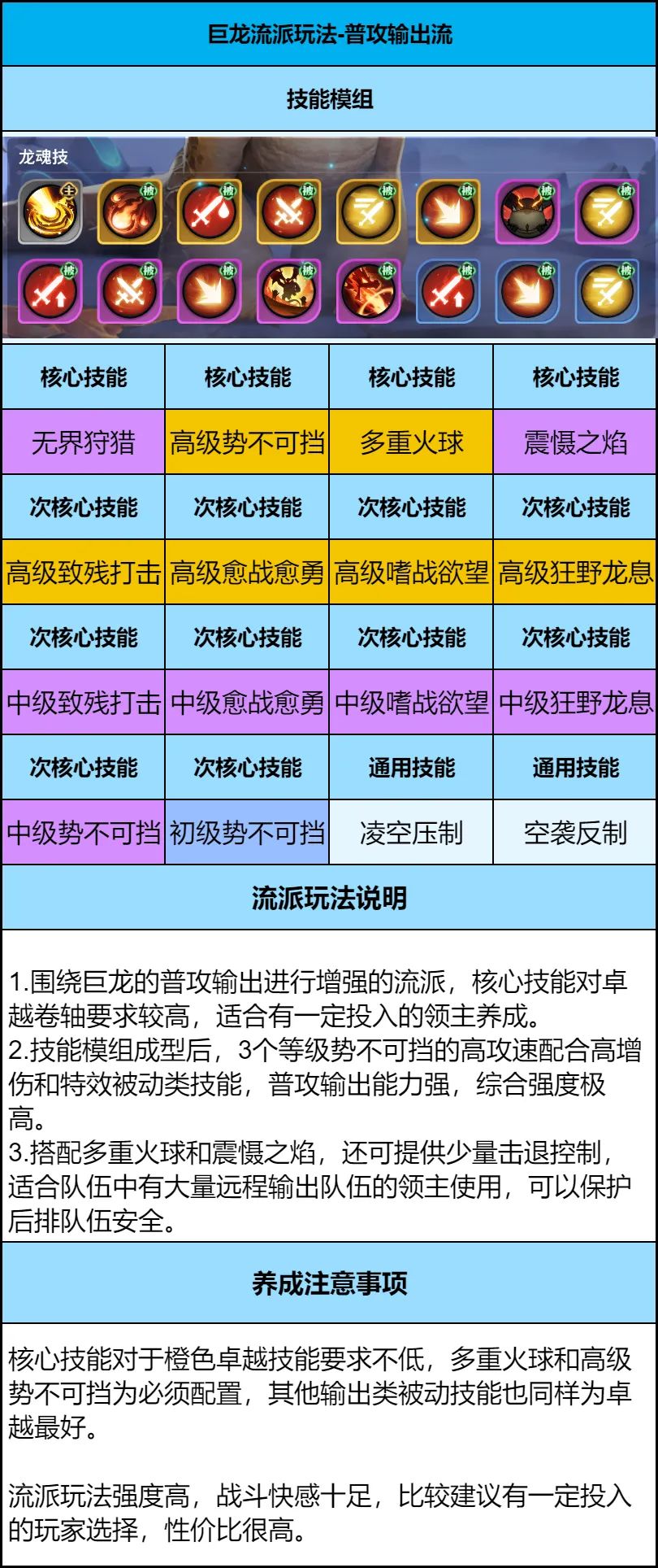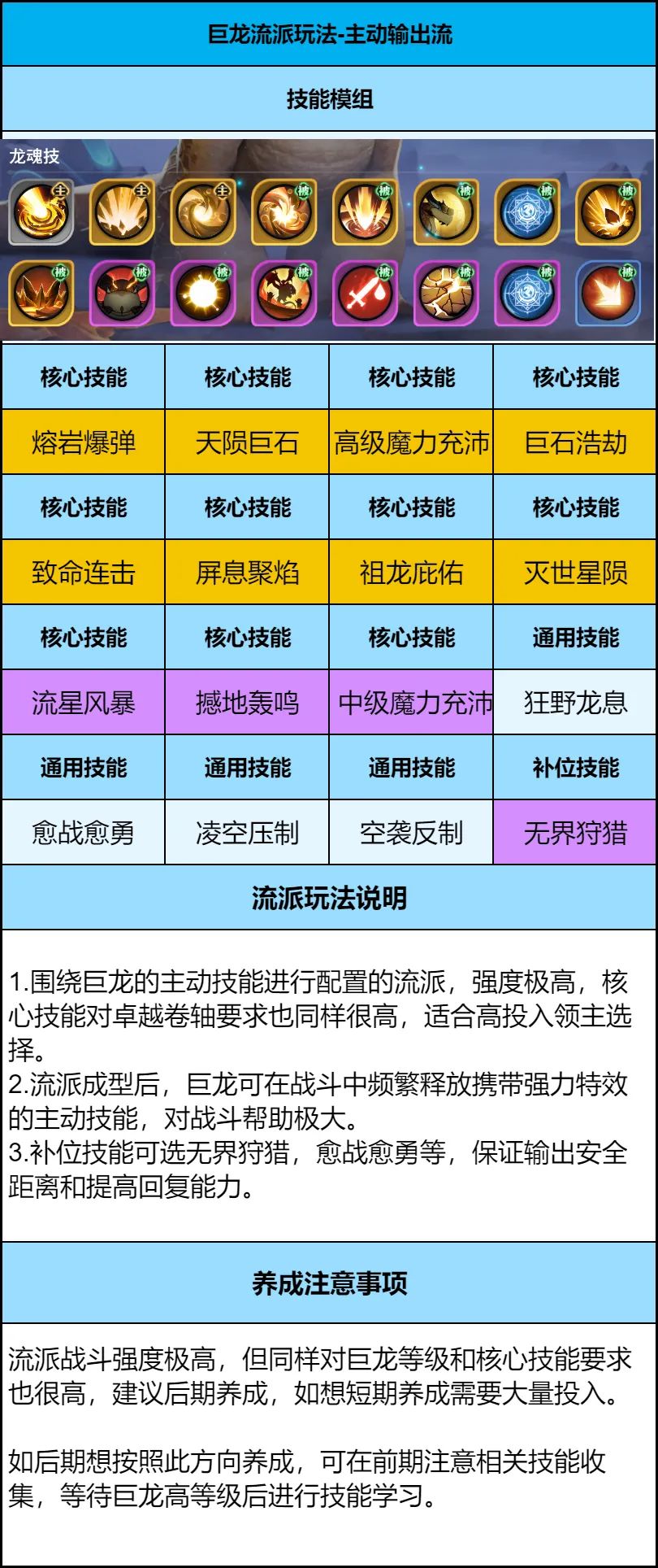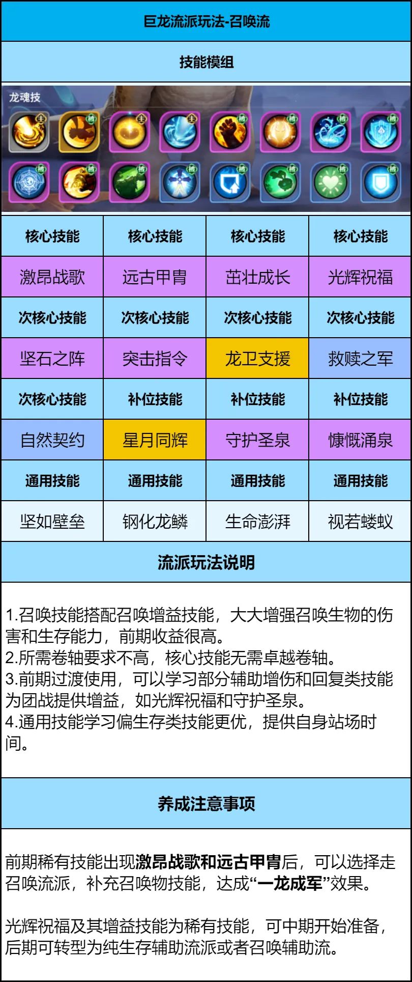 1、巨龙养成前期不需要考虑太多,以低级技能过渡,后期巨龙高等级后,根据获得的技能卷轴,选择不同的流派玩法。推荐前期通用学习技能:光辉祝福、守护圣泉、无界狩猎、震慑之焰。