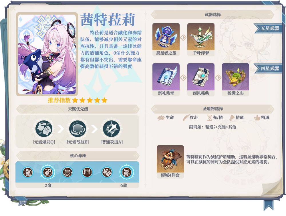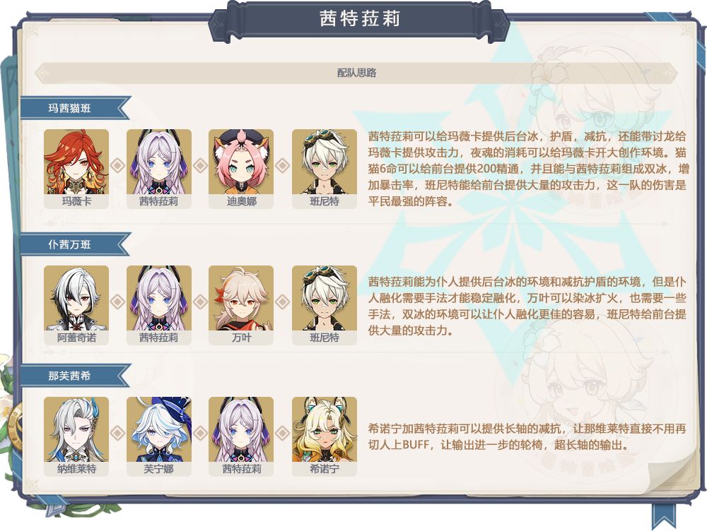2、茜特菈莉抽取建议:适合火神队伍的纳塔战舰补足,其他水火角色需要2命才有不错的提升,0命强度和钟离差不多
