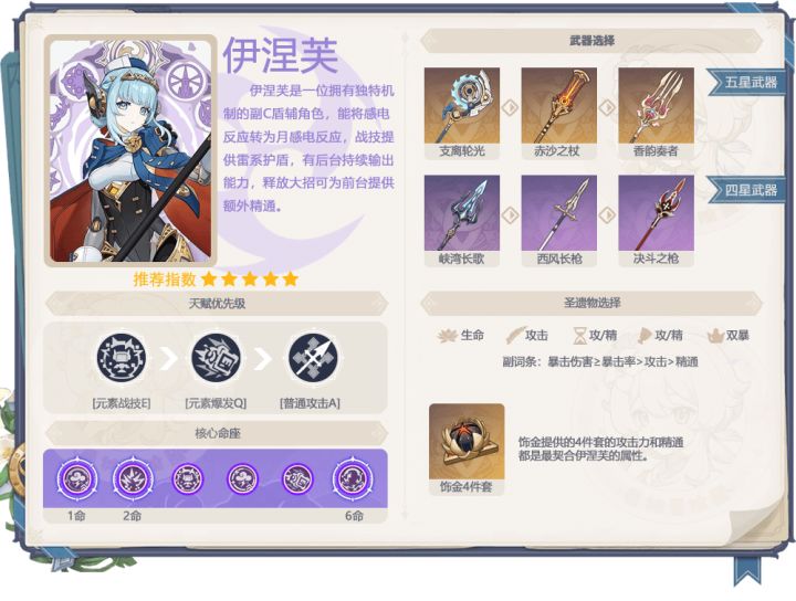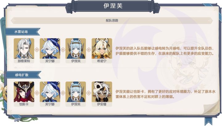1、伊涅芙抽取建议:在大部分带水角色的队伍都有不错的效果,能通过月感电给队伍提供额外输出并提供一定量的护盾,可以考虑抽一只0命作为感电对策卡,1+1是平民抽取的上限