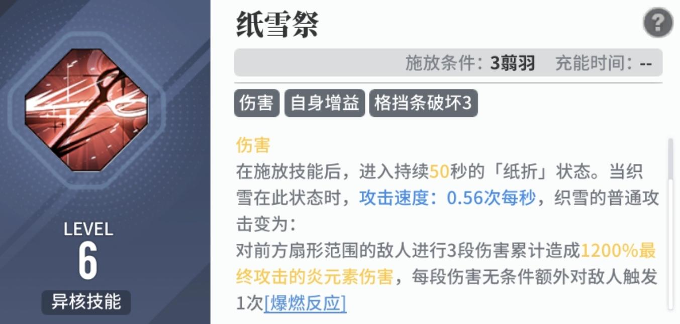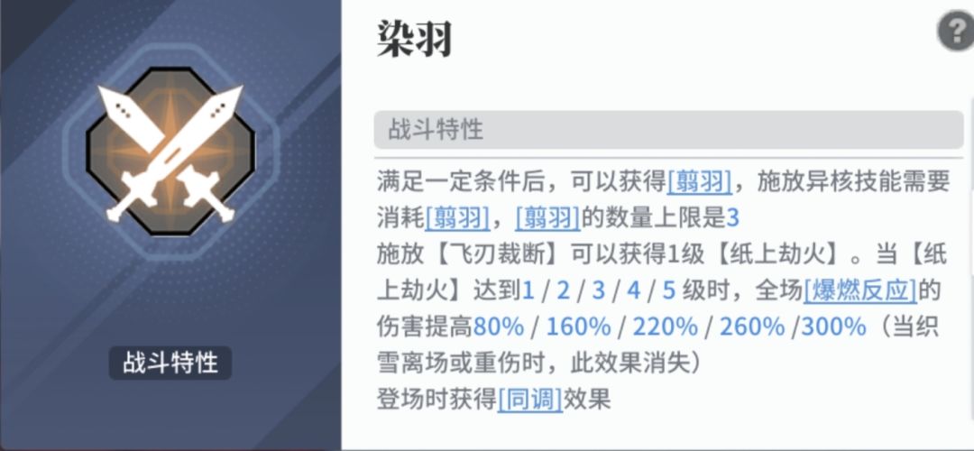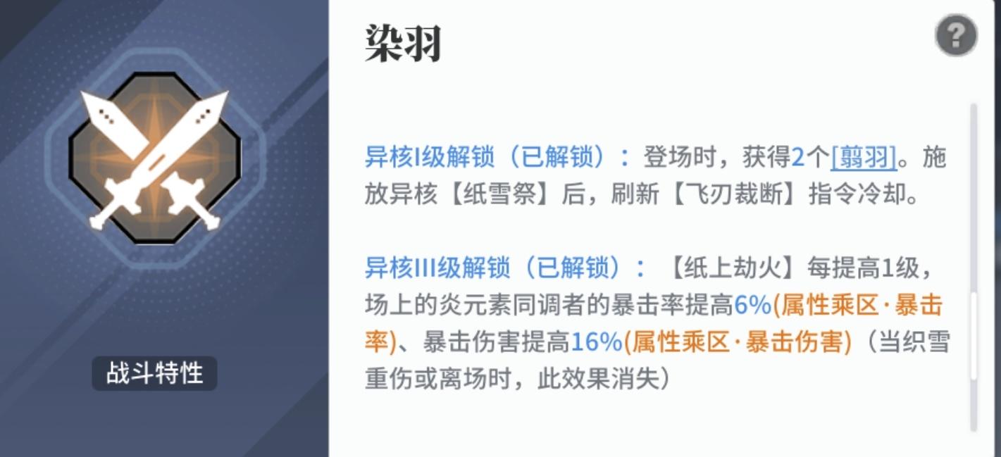 战斗特性:①最多积累3个剪羽,释放异核技能需要消耗3个剪羽,非传统意义上充能。②【纸上劫火】可以通过释放主动技能提高至5级,爆燃反应伤害提高300%。③同调效果有待开发