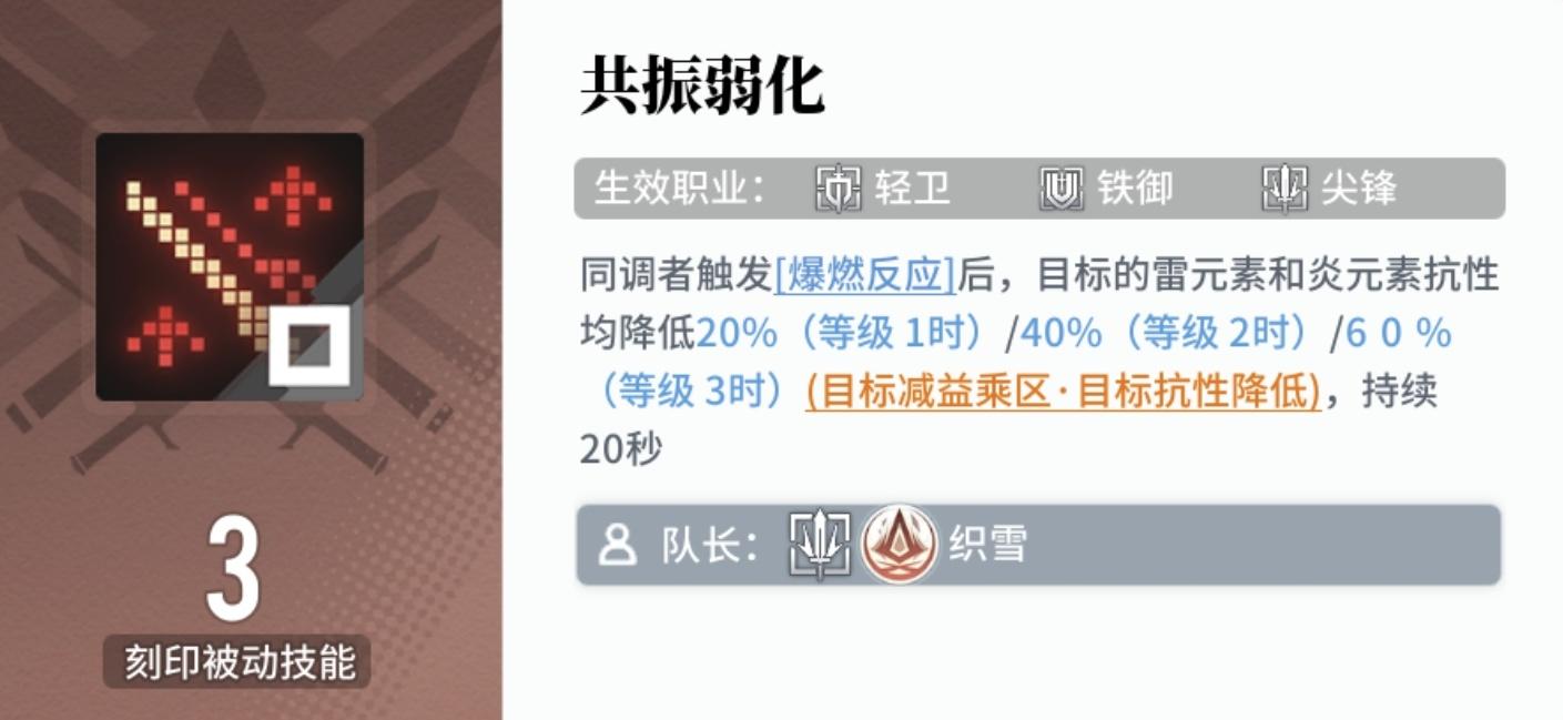 队长技能:60%减雷和火抗性,火队和雷队的刻印衍铸优先选择。