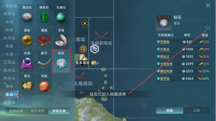 2**本期是我们第三次聚焦西非航线专题,也是最后一次。这次要介绍的主角是在闪耀在西非大西洋沿岸的塞拉利昂(台译“狮子山”)。作为距离欧洲最近的钻石港和独占**木香**特产的香料港。引出本期的两条宝藏航线——近程钻石线与南法木香线。话不多说,大家跟随我打开右上角的小地图,在货品分类中找到两种交易品:钻石(宝石)、木香(香料),并把它们收藏下来。**