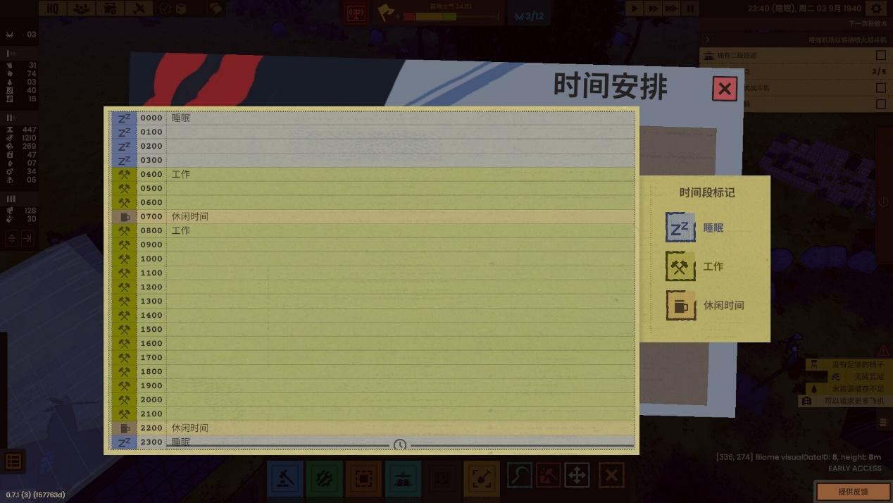 你需要合理分工规划他们,比如采集、建造以及开飞机执行任务等等,常规模拟游戏里的优先级、作息时间表,本作也是有的。