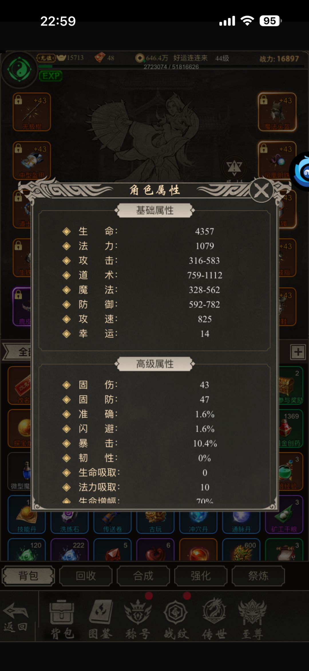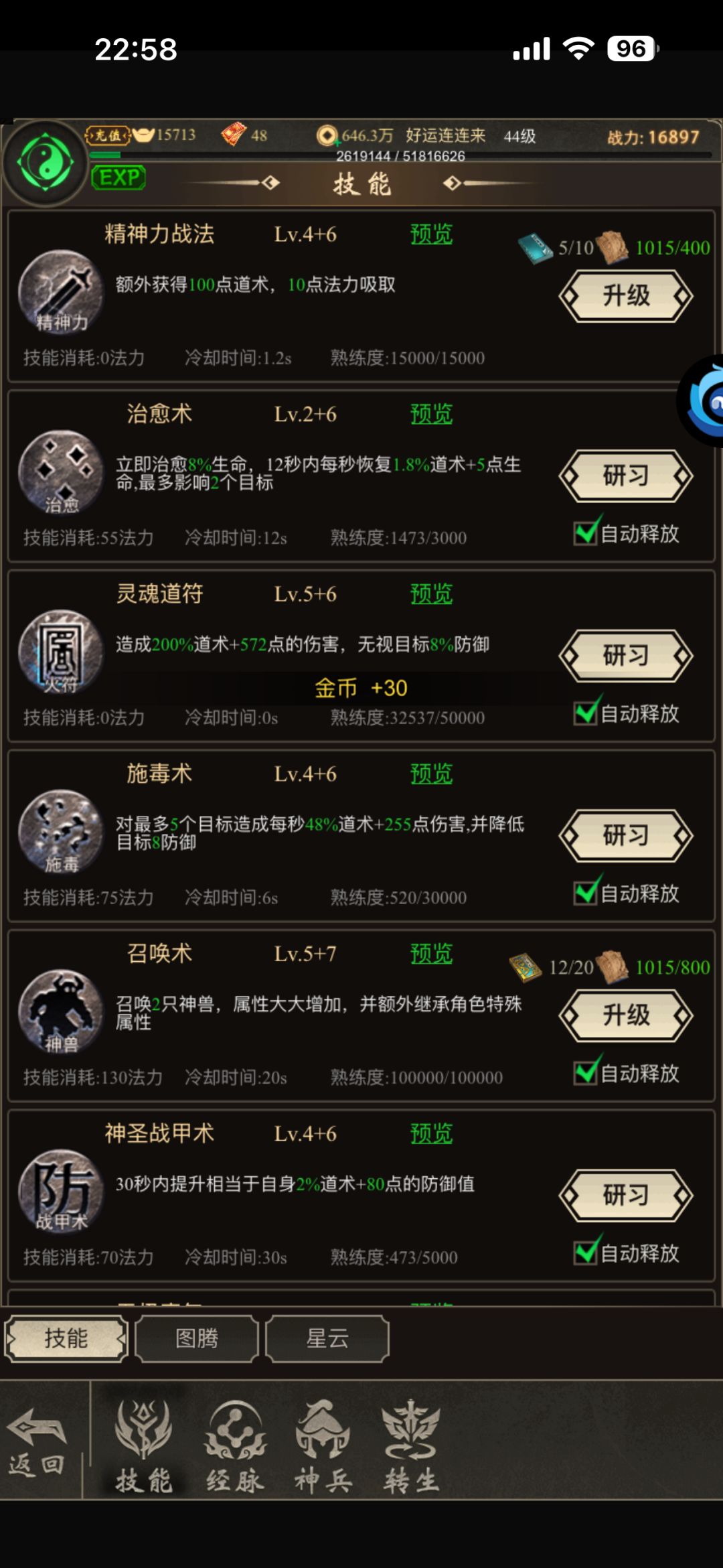 苹果端新服送1万8元宝、全技能书、5800洗练石,相对比安卓要友好很多,玩了四天,感觉还不错,慢慢提升不着急,还是值得推荐的。每天挂图刷刷怪,得空就走一轮Boss,做做日常,跟以前玩传奇用脚本感觉差不多。