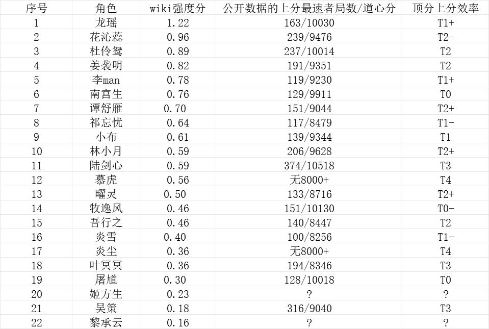 顶分上分效率评价标准:从各角色榜上8000分以上的玩家中取上分速度最高者,统计其局数/道心分并对上分效率进行评级。由于T1、T2的角色数量较多,用“+”表示在同梯队中较强,“-”表示较弱。