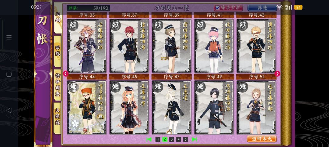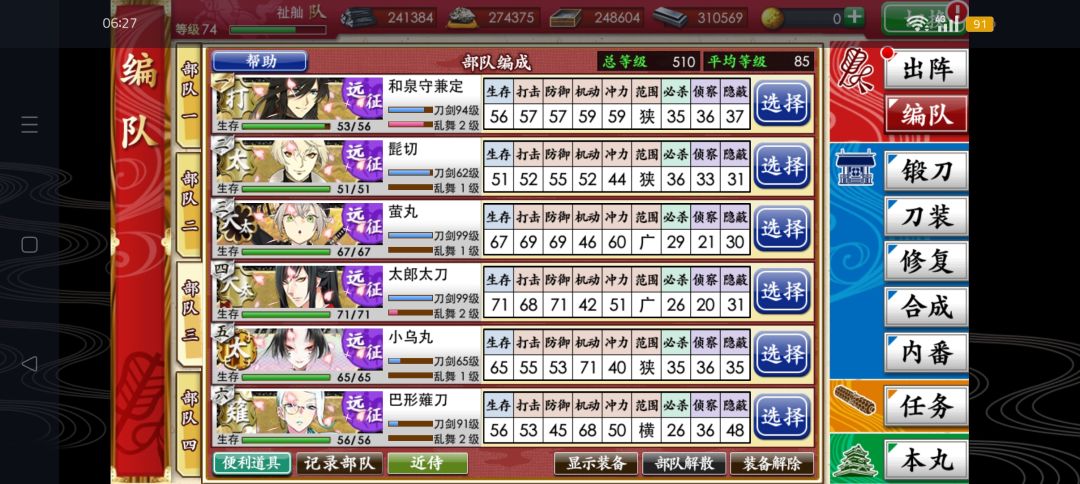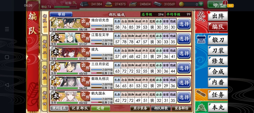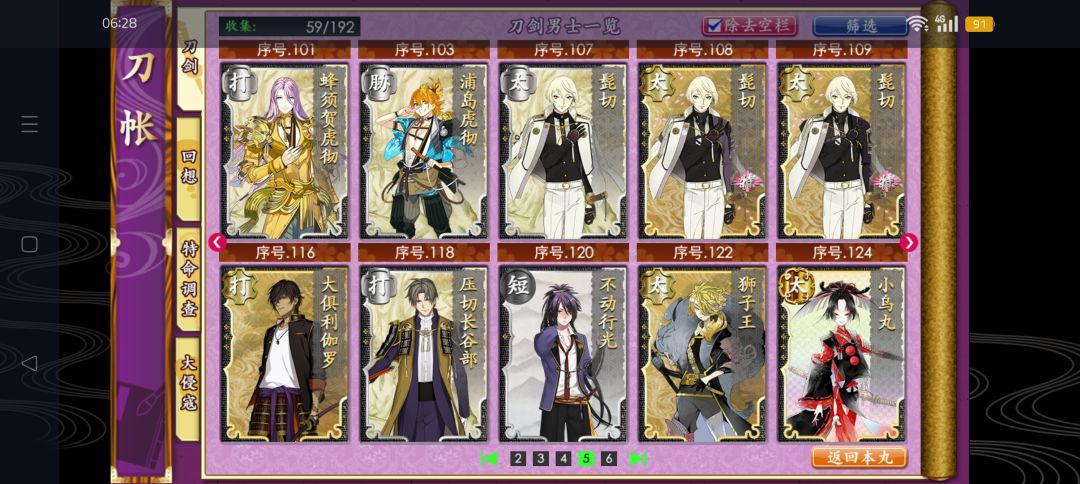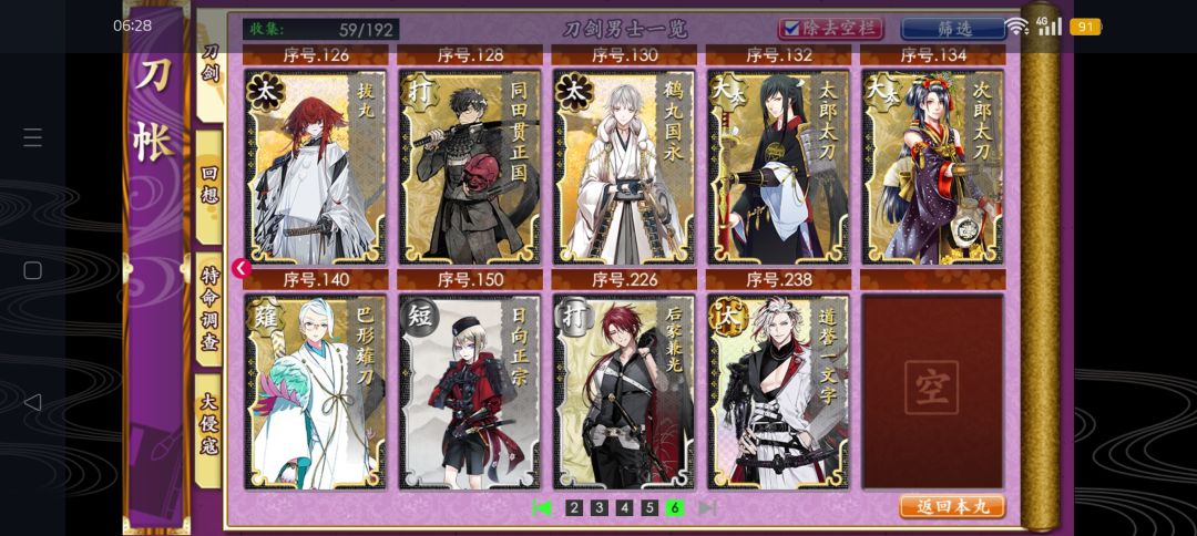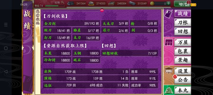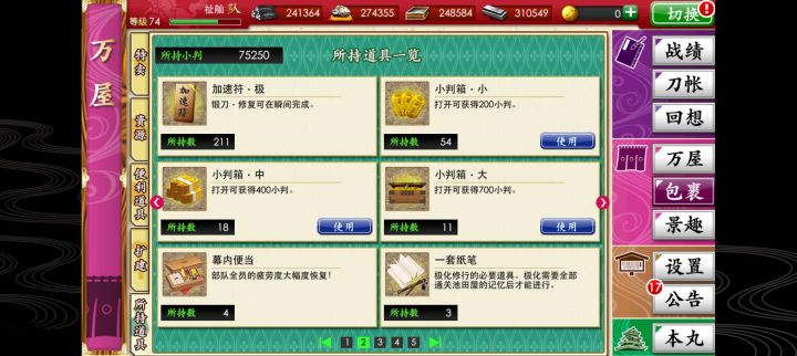 后来联队战+三倍让我练级轻松好多,多亏送的小判,打到了15万,拿齐所有奖励刀还有修行用品,我基本只刷1,预计快到15万的时候刷了几天2,34就没打过,掉了2大包平,1日向正宗,1大般若长光