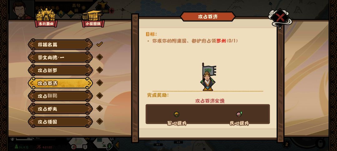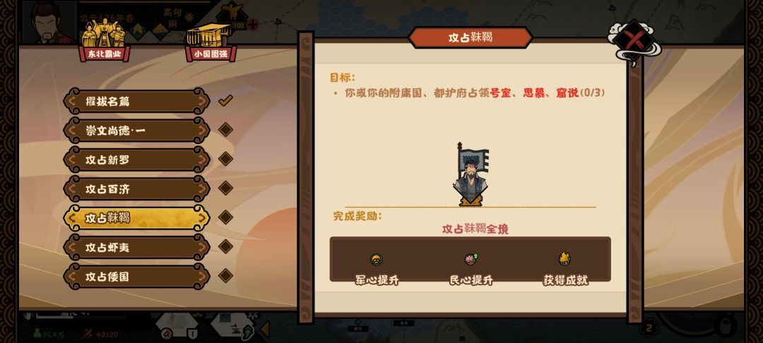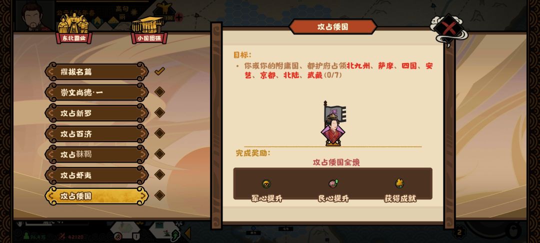 北方的靺鞨部落开局不是很厉害,可以先打他。然后把百济和新罗灭了。最后灭虾夷和倭国。