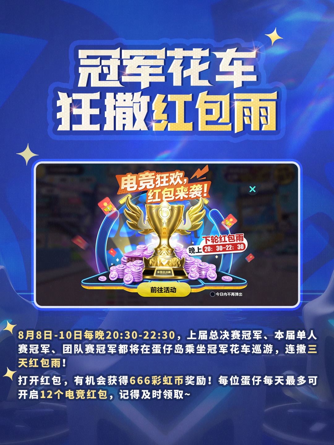 🎁8月8日-10日每晚20:30-22:30,冠军花车闪耀蛋仔岛巡游 ,连撒三天红包雨,红包最高可开出666枚彩虹币!