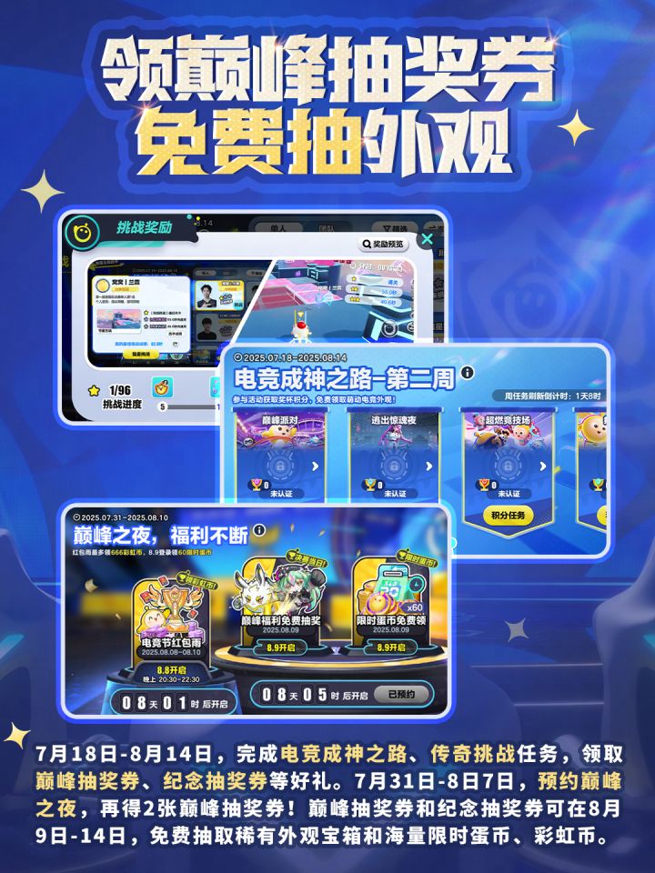 🎁8月9日-14日,使用巅峰抽奖券和纪念抽奖券可参与巅峰转盘和纪念转盘抽奖,可领取丰厚限时蛋币与彩虹币奖励!决赛期间还可免费抽取巅峰拍档外观自选宝箱及电竞手感外观自选宝箱。纪念转盘每次转动最多可得50限时蛋币,一共至少可得90限时蛋币。