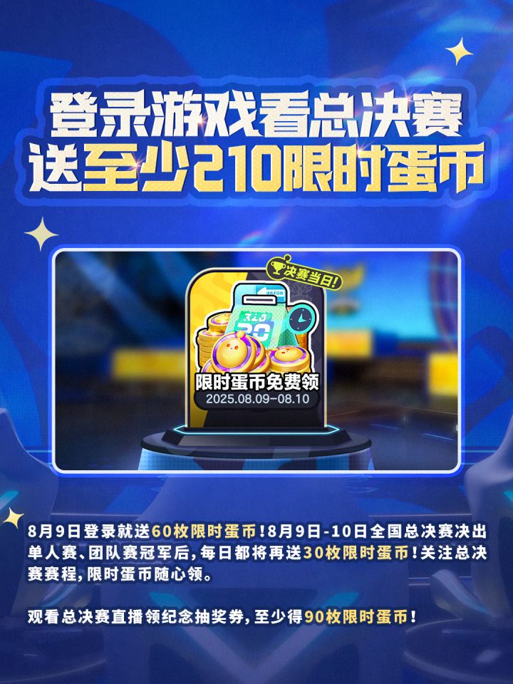 🎁8月9日登录就领60枚限时蛋币!8月9日-10日决出单人赛、团队赛冠军后,每日再送30枚限时蛋币。共120枚限时蛋币直接送!