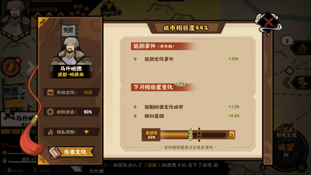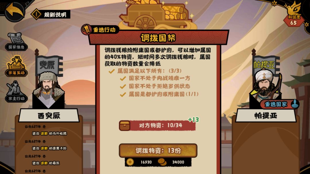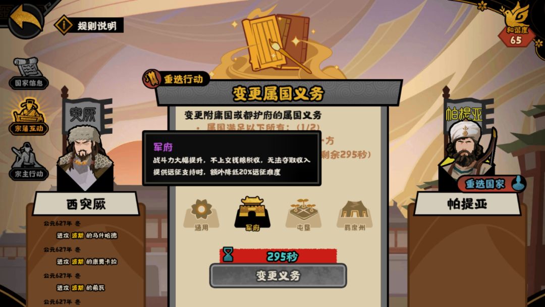 注:西突厥会随着时间,移除自身的buff并失去武将【统叶护可汗】,所以军事目标推荐尽早完成。