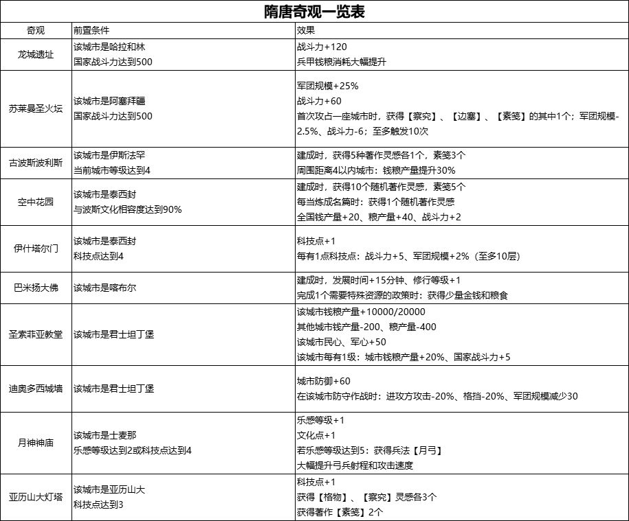 其次是奇观方面的任务,先展示一下本次可能会建设的奇观的前置条件,具体可见下表: