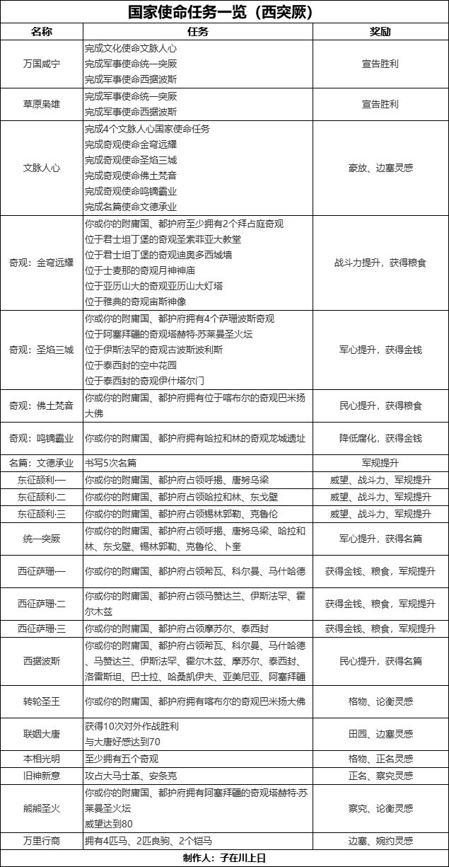 本次西突厥攻略,核心是完成一个文化使命与两个军事使命,从而满足结局需求。因此我根据获取方式,将国家使命任务分为三个阶段进行讲解,三个阶段并不存在固定的先后顺序,王上们根据自身喜好完成对应的使命任务即可。