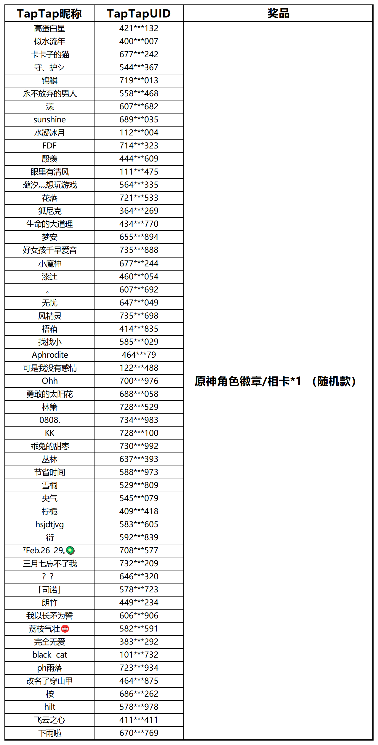 恭喜以下45位旅行者获得【原神角色徽章/相卡*1 (随机款)】一份~