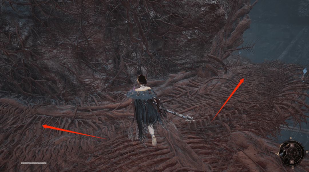 这里我们到达岔路口,走右侧箭头位置,前方记得先击杀远程小怪,击杀后不继续往前走回到红色大树这边沿着箭头位置继续前进拾取【萌发的赤汞*1】。
