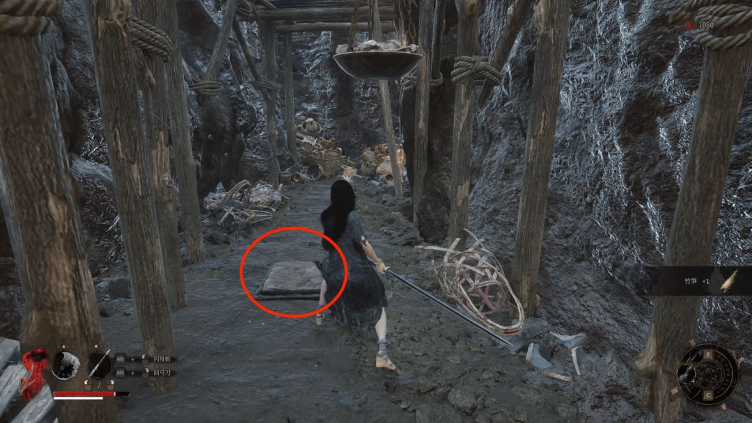 前方桥上笋精记得锁定攻击击败获得【竹笋】。继续前进末端洞内有陷阱,小心从旁边移动不要踩压力板触发机关,尽头处宝箱拾取【黯淡红羽】。