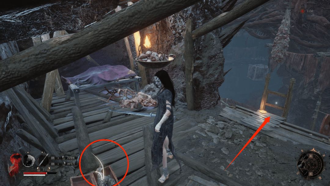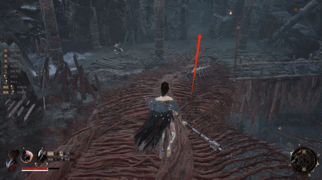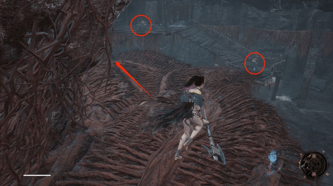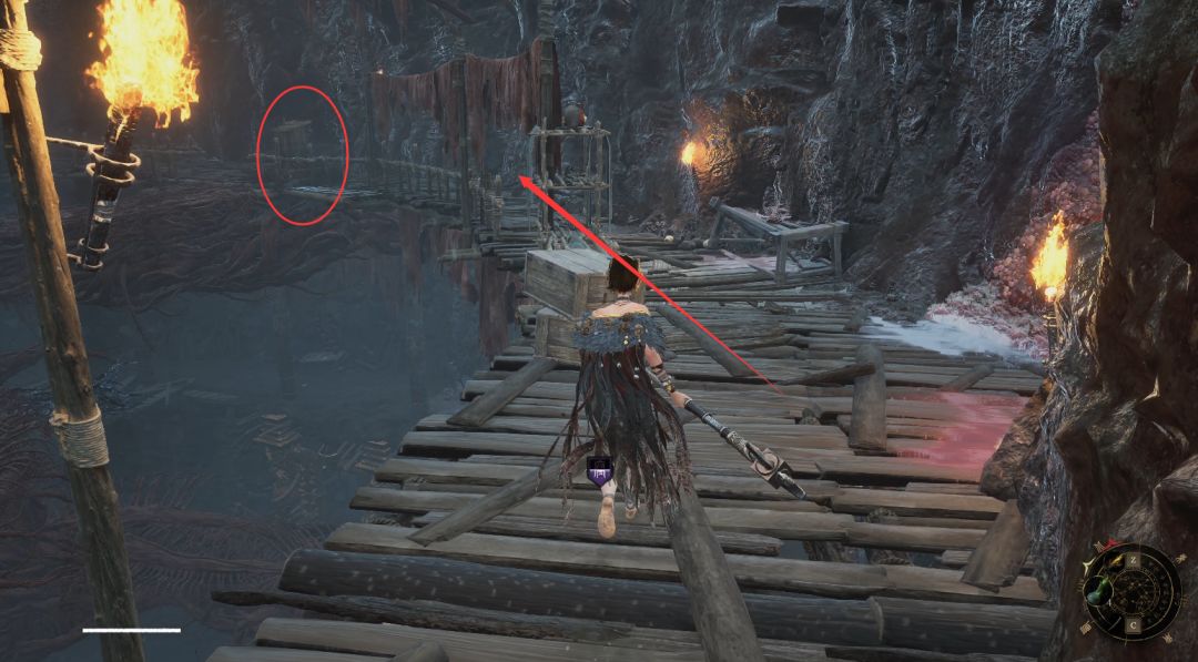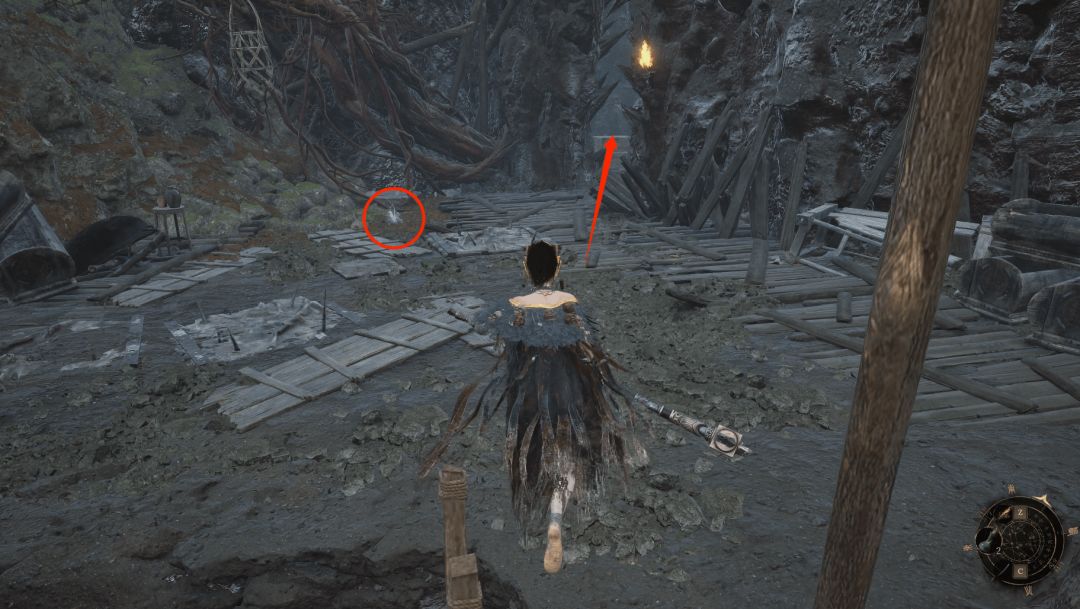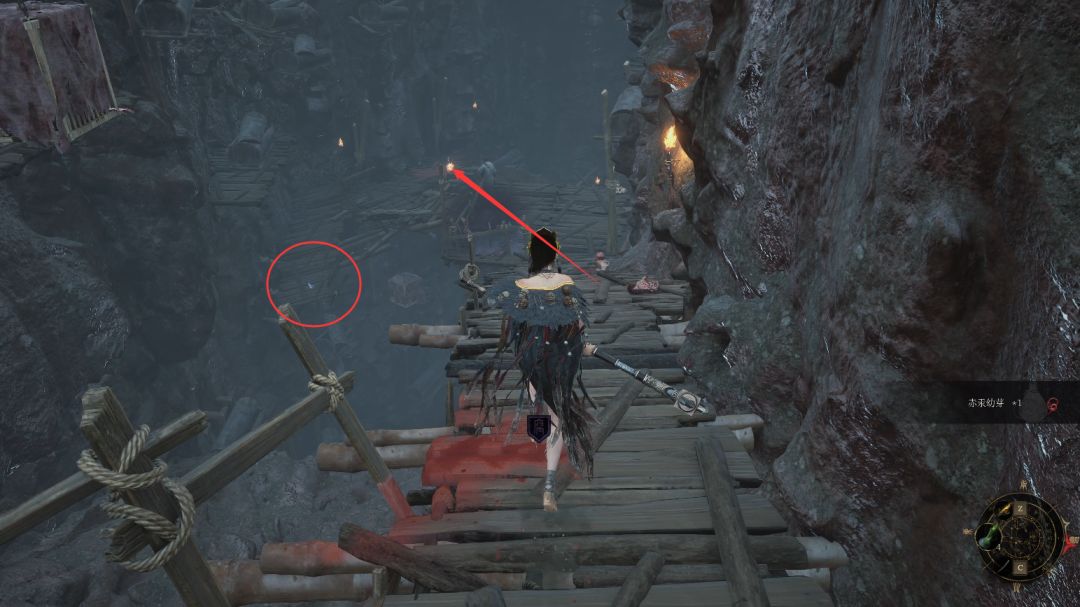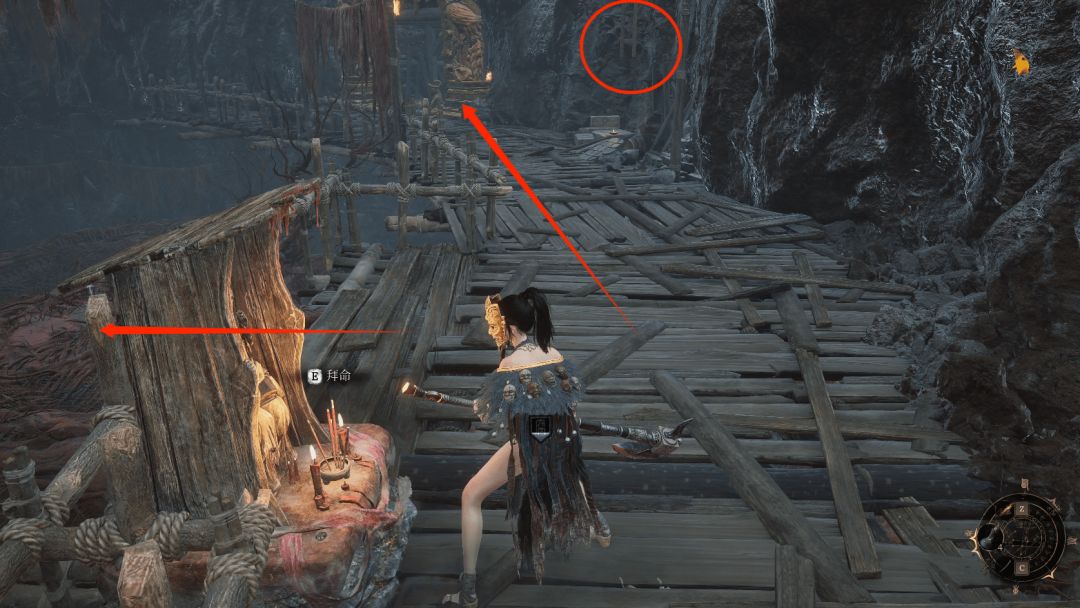 拾取后回头沿着悬崖边缘的木架子沿着箭头处直走,前方圆圈处就可以拜命赤炼工坊神龛啦。