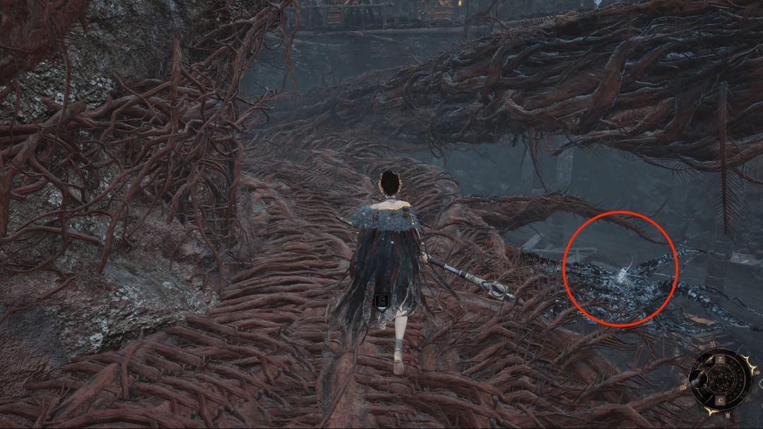 下楼梯圆柱后面拾取【紫山茶*3】,继续往前走拾取【萌发的赤汞*1】。继续沿着木架子向下走,箭头方向是主路线前进方向,记得回头圆圈处拾取【萌发的赤汞*1】。
