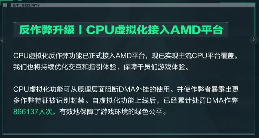自虚拟化功能上线后,其反作弊效果立竿见影。《三角洲行动》官方数据显示,目前已经累计处罚 DMA 作弊 866137 人次。CPU 虚拟化功能从原理层面阻断了 DMA 外挂的使用,使作弊者暴露出更多作弊特征,从而被系统精准识别和封禁。