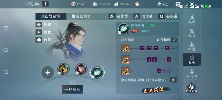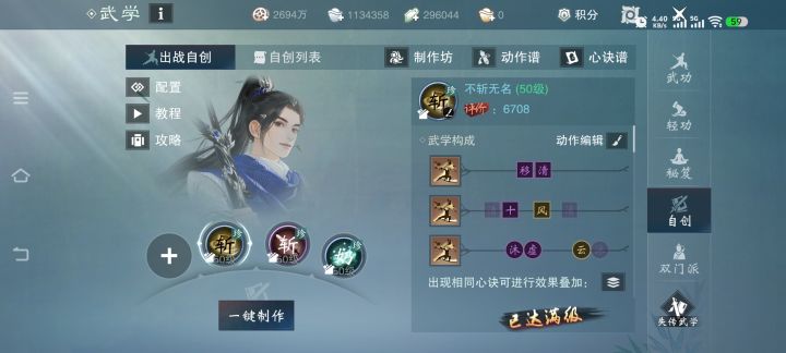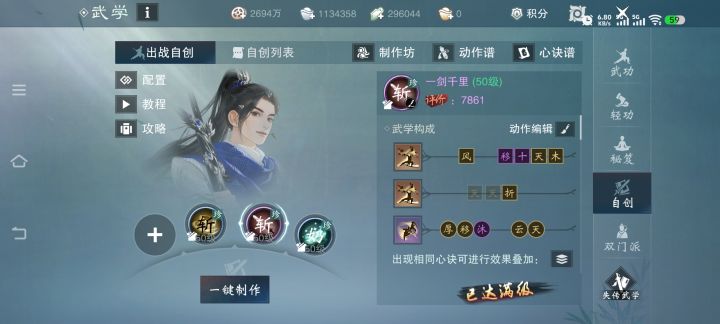 每周打完本必做的事,那就是兑换招式合自创!好几个礼拜没出蓝色了,今天终于合出了一个蓝色,之前蓝色都是打来卖,定价60多万一个,现在卖得人太多了,不值钱了,自己用也挺好,金色紫色心诀囤了一堆,全顶完了,做这种自创主要为了论剑先手,唯一不足的是顶掉了6个天光,只能用清光平替了