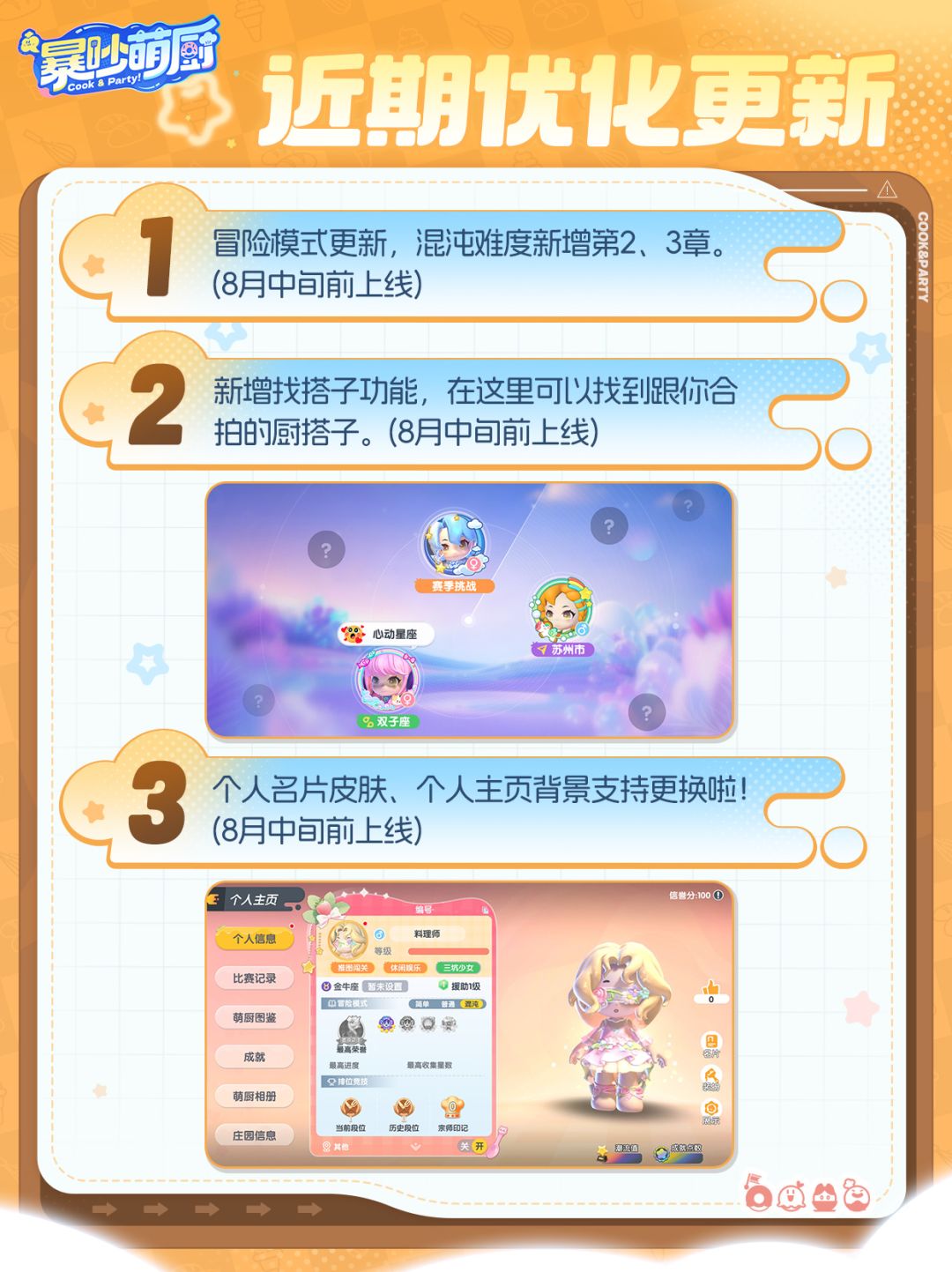冒险混沌难度更新、搭子大厅CPDD、个人主页及名片皮肤更换、社区广场交互优化、关卡优化
