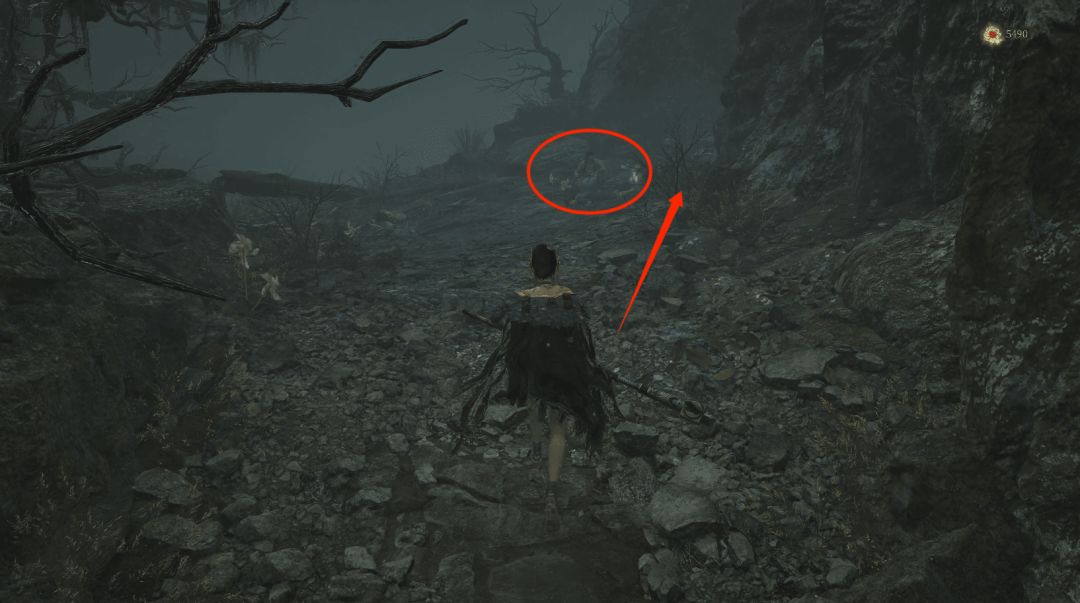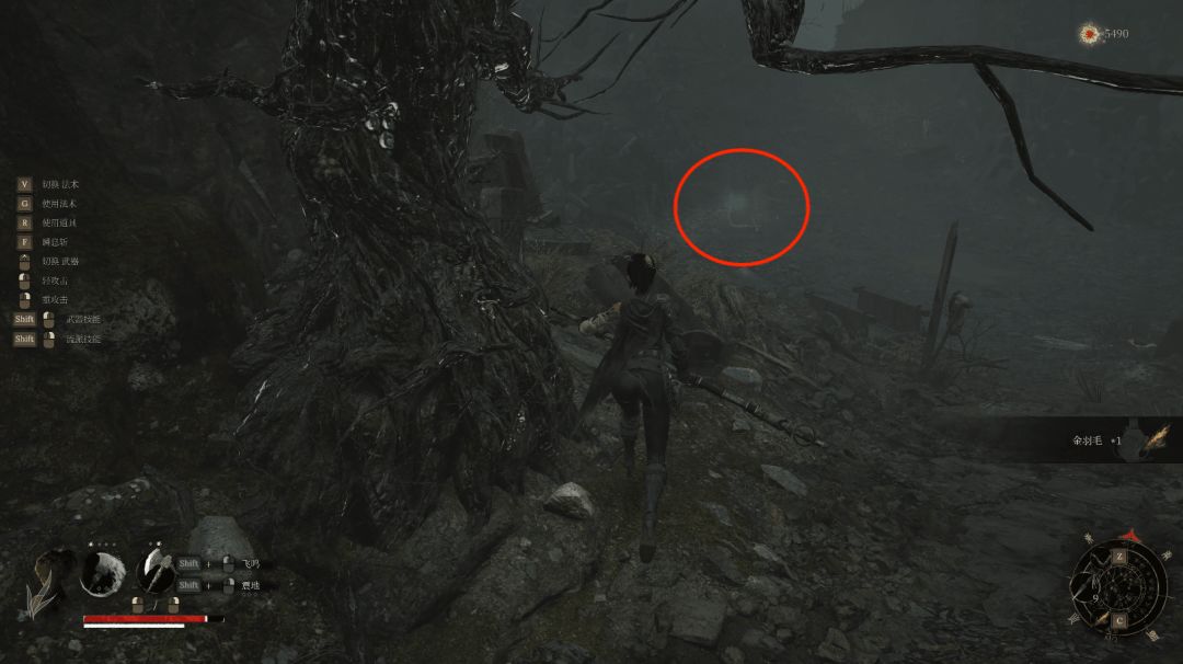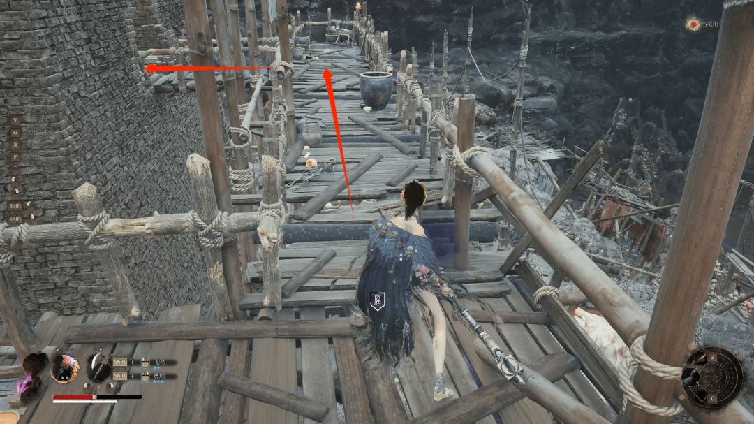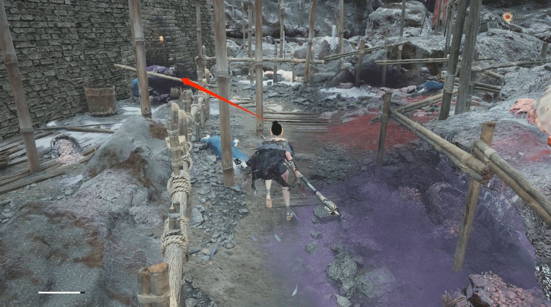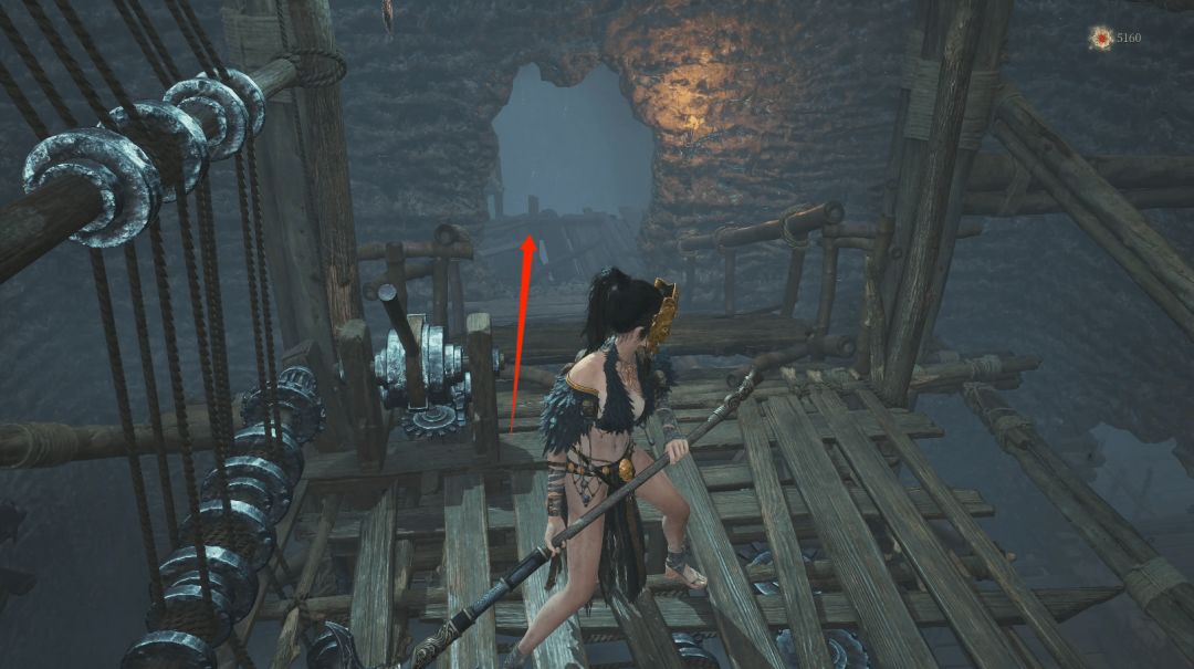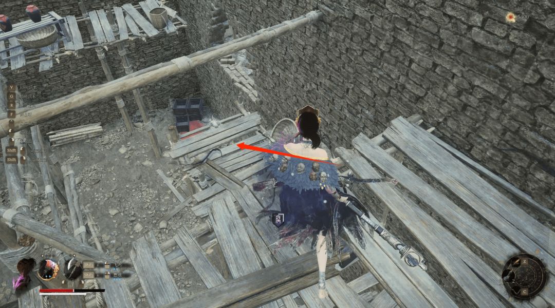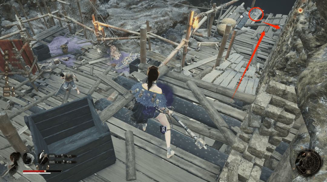 往左箭头则进入塔内中层木平台后向下,箭头位置拾取【黯淡红羽】。