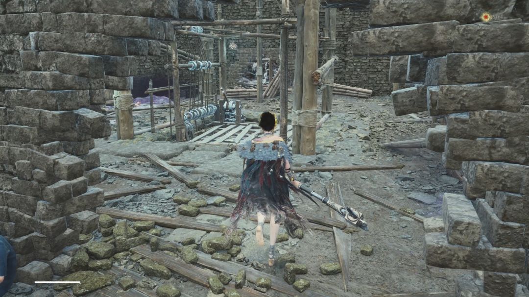 乘坐活祭塔电梯来到顶层,到达顶层后不急着走主线路径,转身向后看到木质平台后沿箭头方向跳到下方平台。