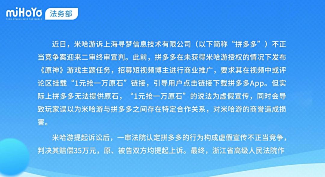 米哈游诉拼多多案终审:判赔100万认定双重侵权