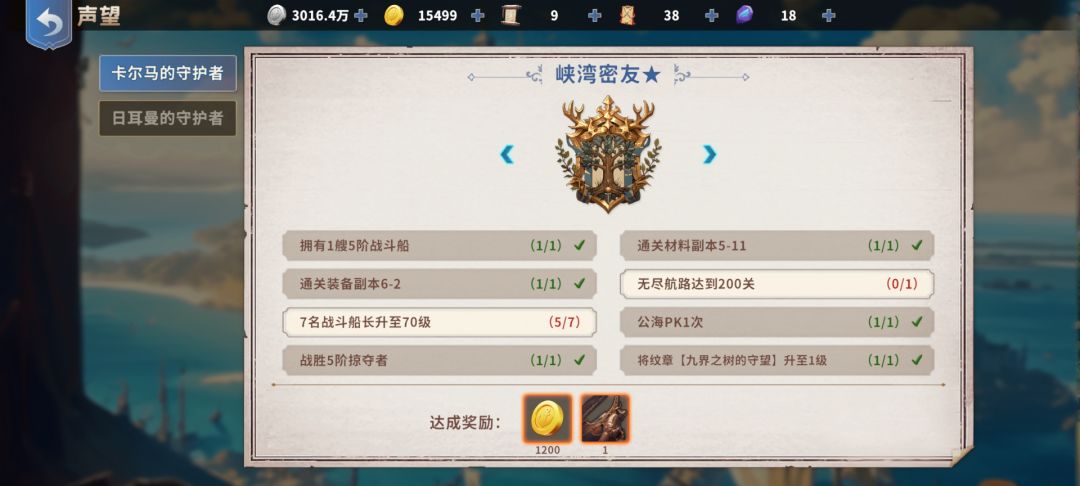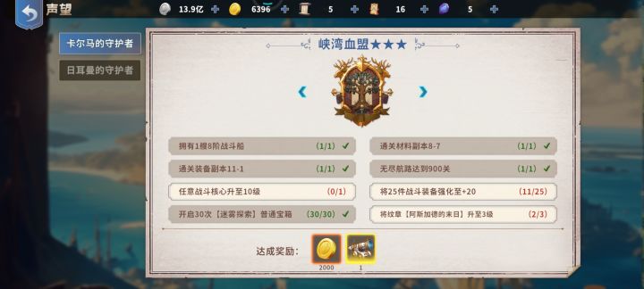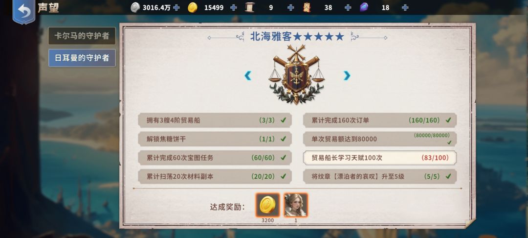 3:单线贸易问题:橙色之前跑双边,两边都开了第一个橙色货物后相信你的船和贸易船长也有了一定的强度,这时可以选择马卡尔和日耳曼其中一条线单边贸易,这样可以最快速度开到金货材料,每天30刷不出来我还能掉头去跑另外一边的橙货何乐而不为?马卡尔声望任务是雷利和一套商城648那种金装,日耳曼贸易单价稍高,声望奖励载重藏品和卢克,后续奖励可以用过声望任务左右箭头查看,可以根据自身进度和喜好选择。