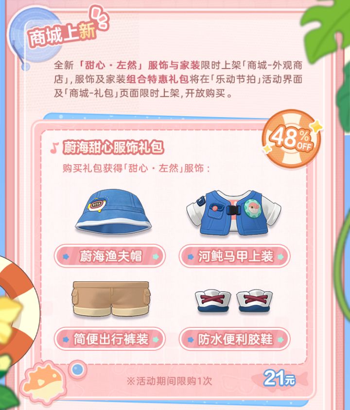 活动期间,全新「甜心·左然」服饰与家装限时上架「商城-外观商店」,服饰及家装组合特惠礼包将在「乐动节拍」活动界面及「商城-礼包」页面限时上架,开放购买